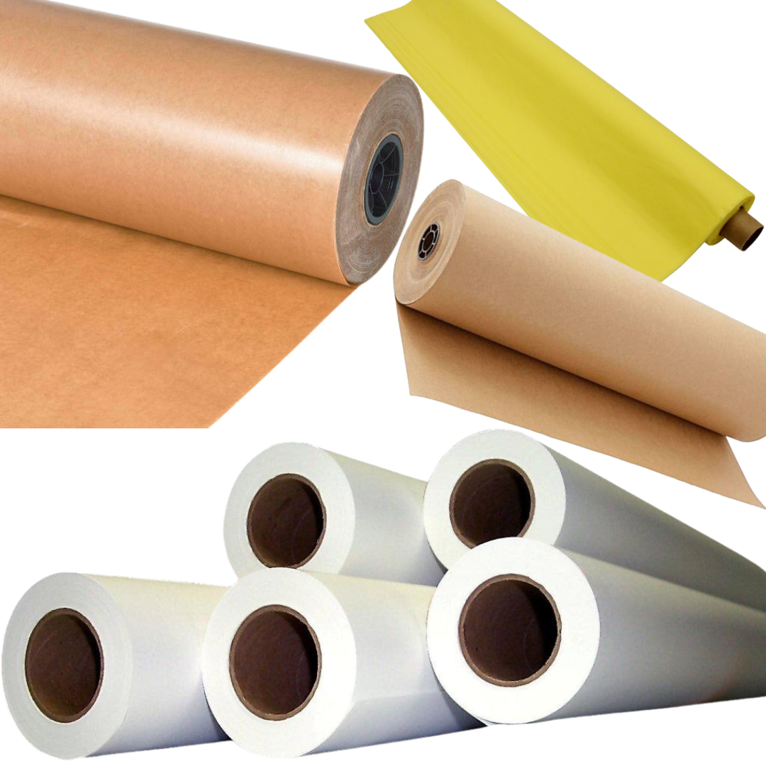 Rolls of various weight, width, and length available in Kraft, Perforated Kraft, Tissue, Wax, Plotter, and Butcher Paper.